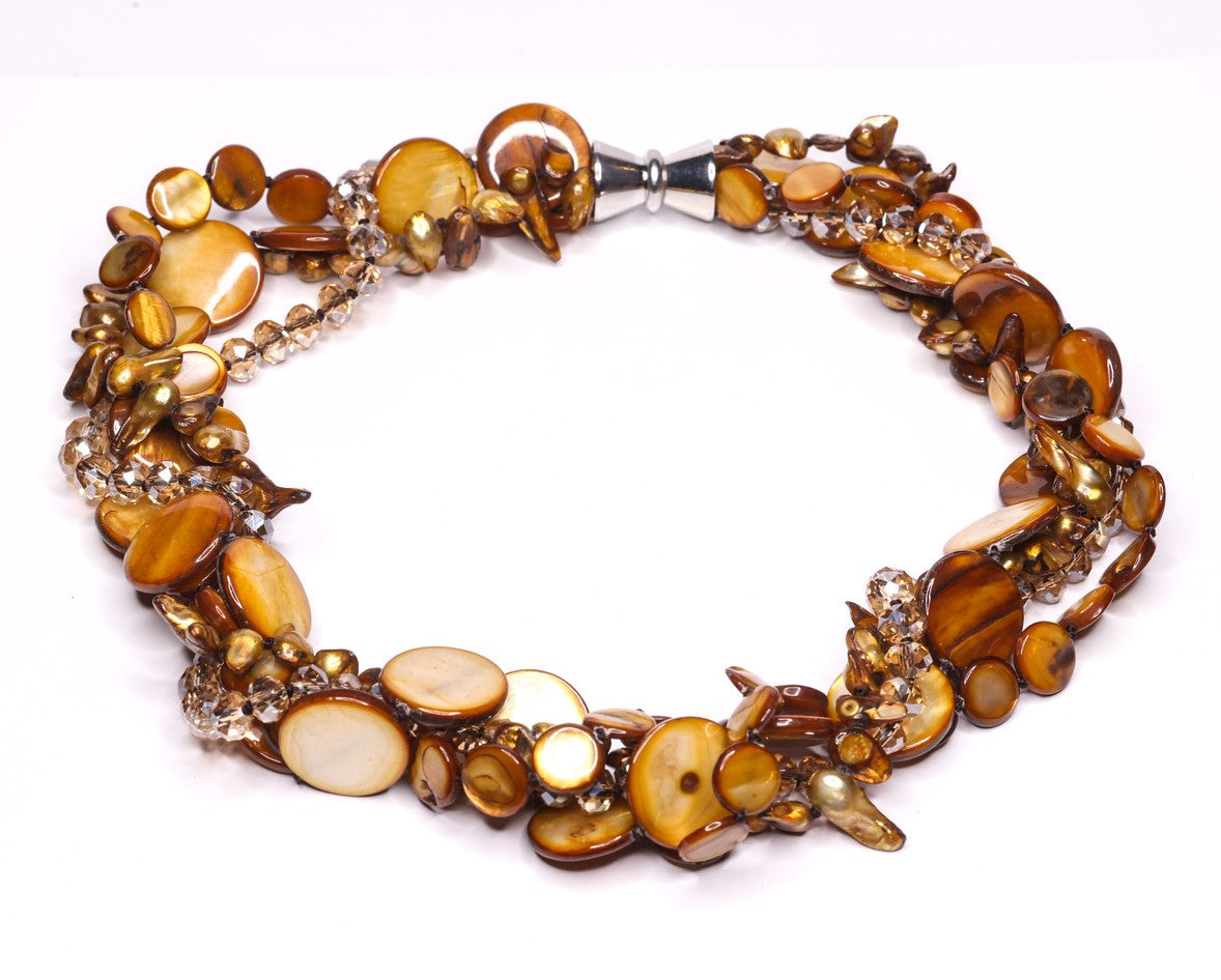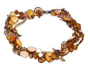 Nydelig kjede og armbånd i fargede ferskvannsprler, skjell og fasettslipte glassperler. Kjde og armbåndet består av 4 rader som kan tvinnes eller henge løst.